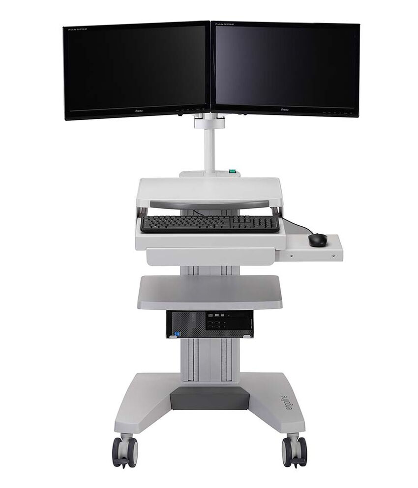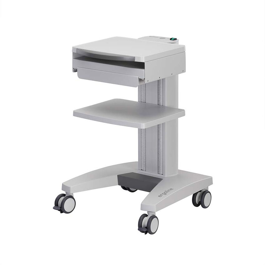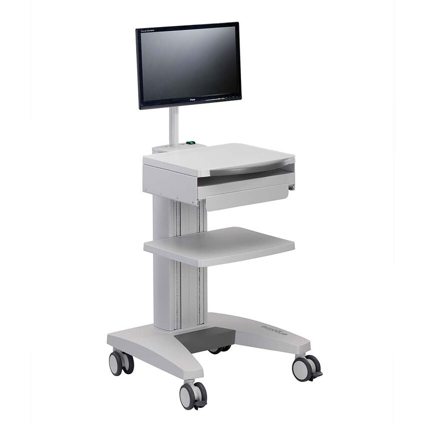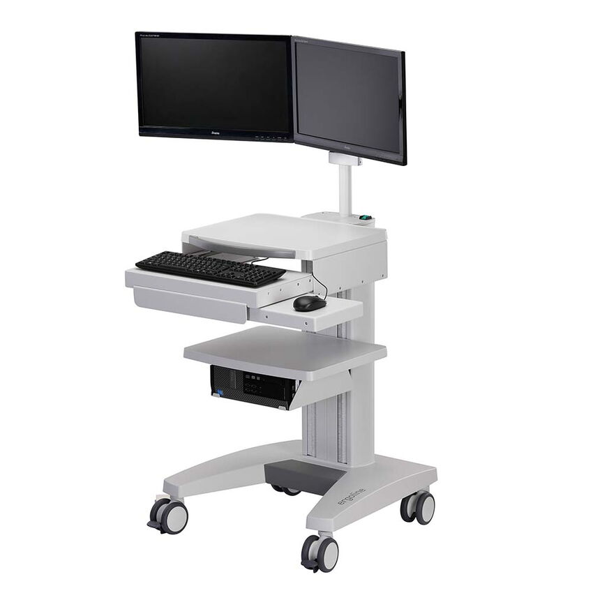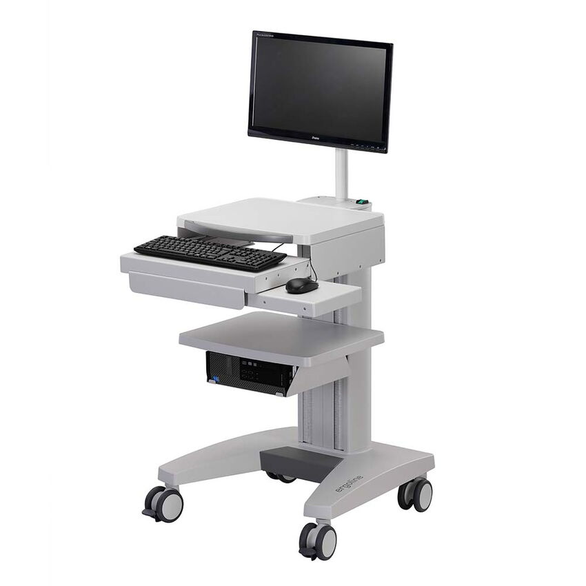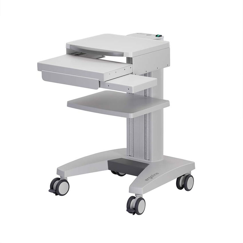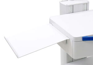 Der kompakte Tastaturauszug wird unterhalb des obersten Ablagebodens montiert. Beim mobilen Einsatz des Gerätewagens kann eine Standard-Tastatur bequem unter den Ablageboden geschoben werden. Das ebenfalls ausziehbare Mauspad kann sowohl rechts, wie auch links montiert werden.
