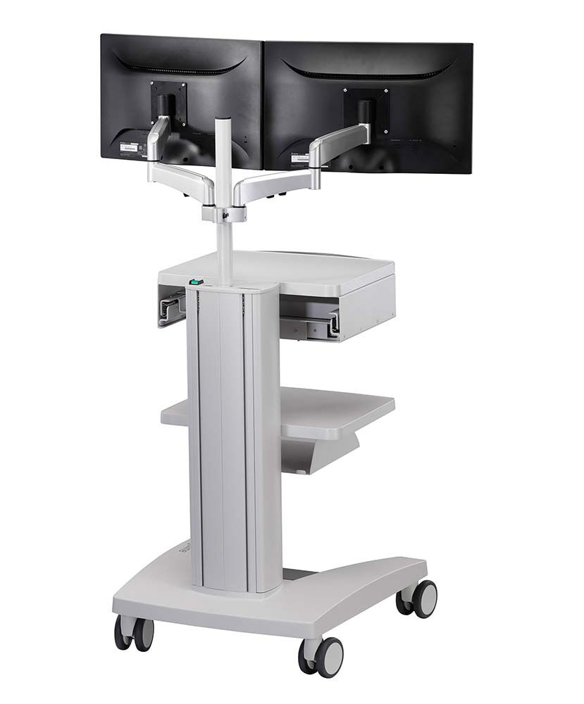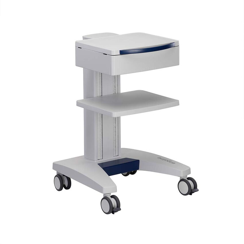 Alle Ablageböden werden aufwändig in Aluminiumguss gefertigt und anschließend pulverbeschichtet und sind bis zu 20 kg belastbar (Flächenlast). Die Breite der Böden ist so bemessen, dass auch eine Standardtastatur problemlos platziert werden kann. Komfortable Griffe zum leichten Verschieben des Gerätewagens sind in verschiedenen Ausführungen und Farben erhältlich.