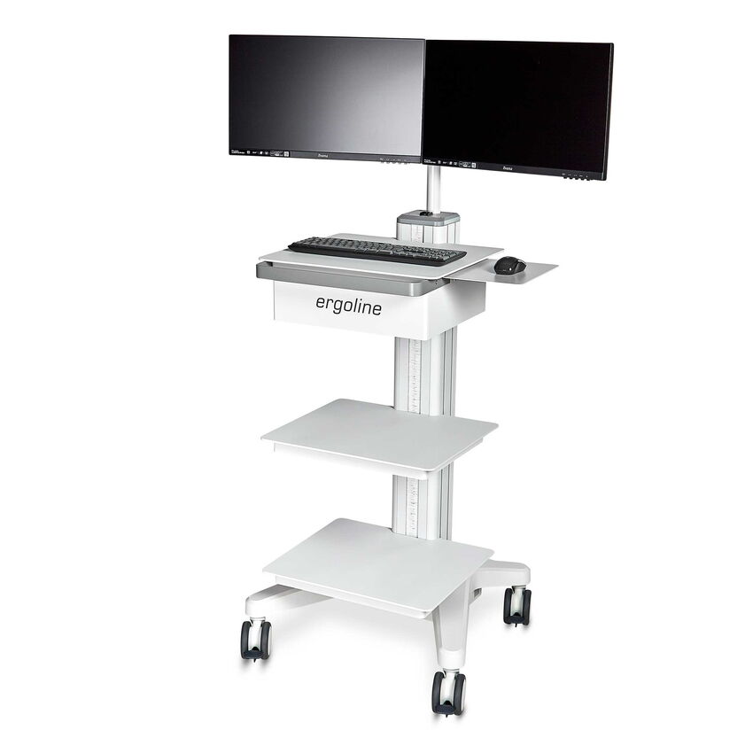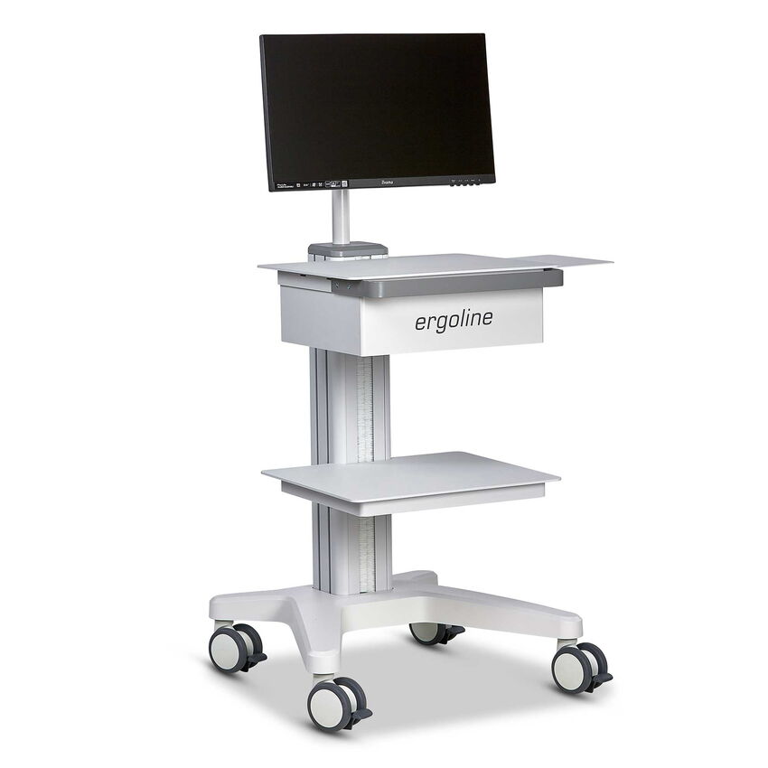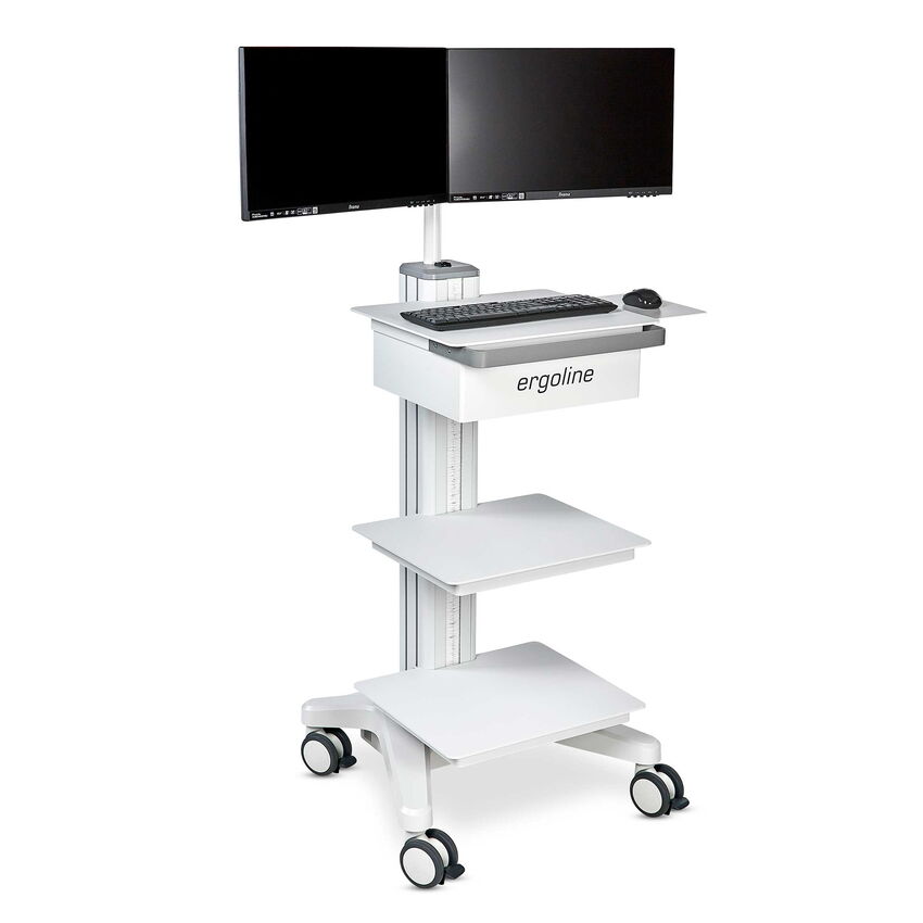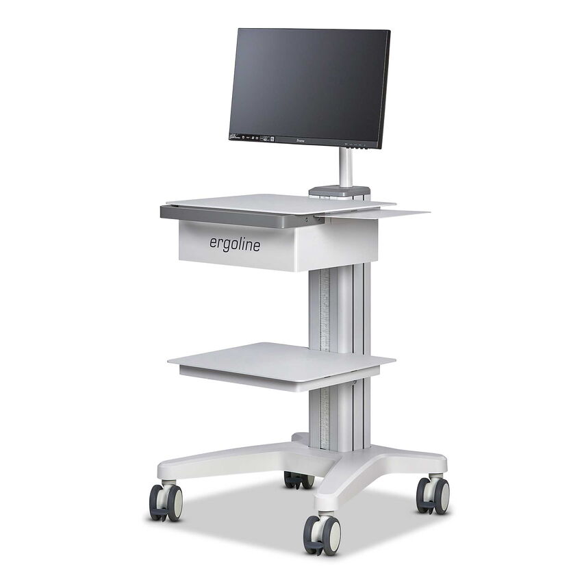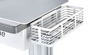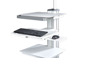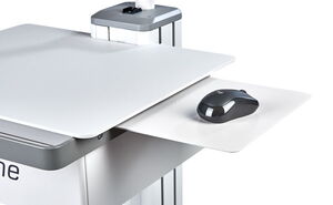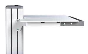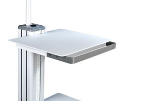 The compact slide-out keyboard tray with pull-out mousepad can be mounted anywhere on the support column under a shelf. If the equipment cart is in mobile use, a standard keyboard can easily slide under the shelf.